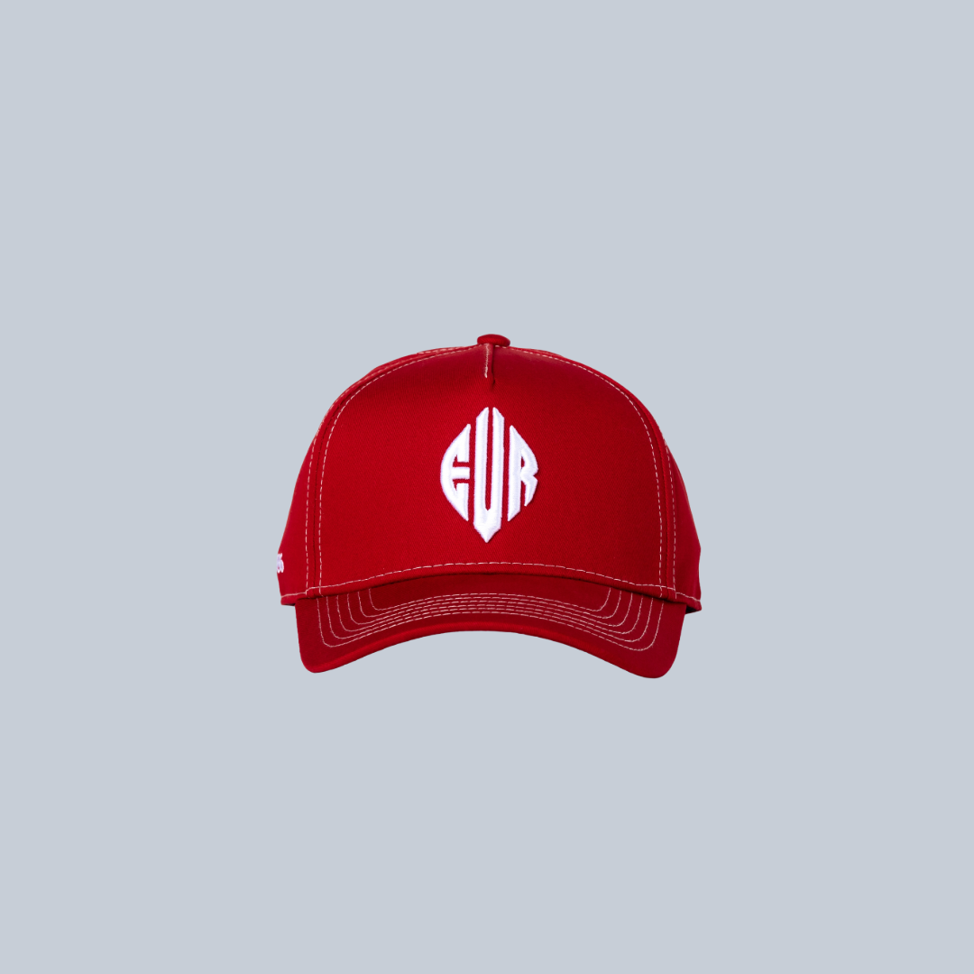 The Red Racing 5-Panel hat features a structured design with a curved short visor, made from a 100% cotton twill. An adjustable strap closure ensures a customizable fit. One size fits most.
